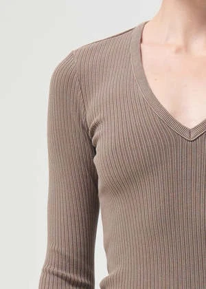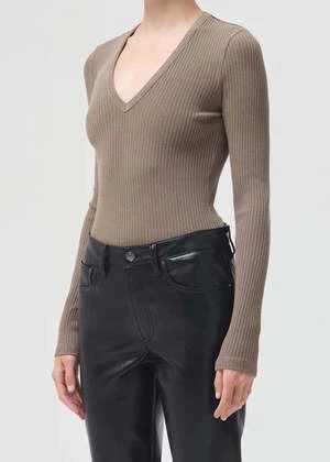 this bodysuit features a flattering, deep v-neck, sleek long sleeves.