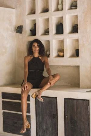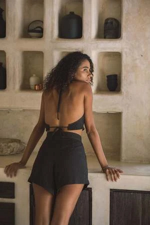 A casual tailored look. Features a highwaist, shell button/ zip entry, side pockets and pleated front. Model wears XS in charcoal cotton crinkle.