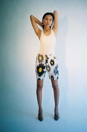 Ecru waffle perforated body suit. Low scoop neck with racerback. Snap closure at bottom.