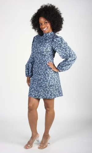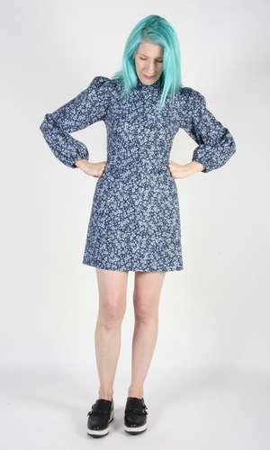 Nyctale is a 60s inspired cotton printed dress with a stand collar, full sleeves that gather at the cuff, and flat pockets in the skirt.