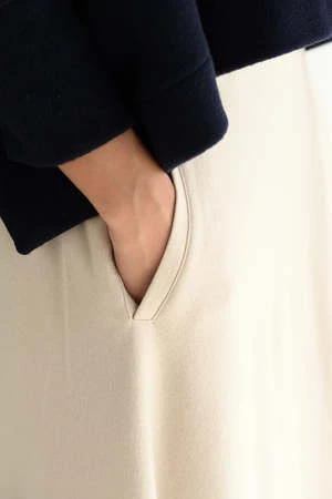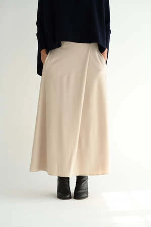 A-line skirt features wrap-like tucks which create a sleek look around the waist. Side pockets add sharpness to the feminine look of the full skirt. Made from milled jersey created from high quality pure wool with a soft touch.