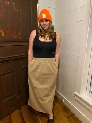 A lightweight skirt with a flair for the romantic. Sits at waist, is midi length and an easy pull-on waist that’s comfy and flattering. Has a slit in back so you can easier move in. Made with cotton and easy to pair with your favorite top or sweater for those chillier nights. Most importantly has pockets!