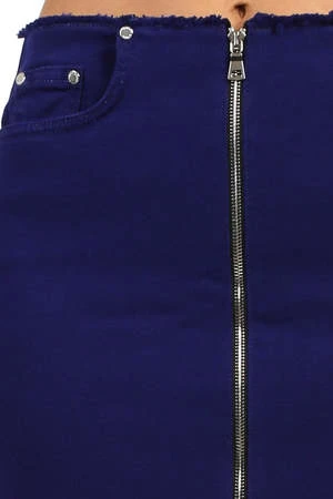 A bold zipper runs down the entire front and back, splicing this raw edge denim skirt for an edgy, urban look. A subtle stretch ensures a perfect fit and strong recovery to this Handcrafted and dyed mini.
