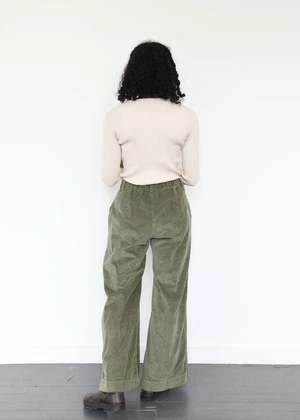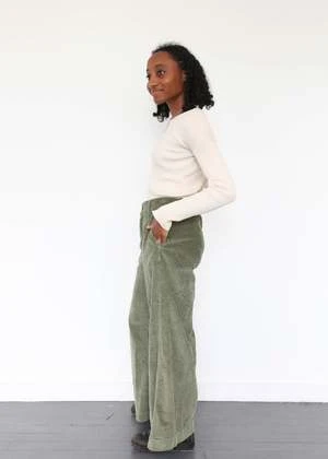 Polly is a wide-leg pant featuring a zipper, pockets, and elastic across the back waist.