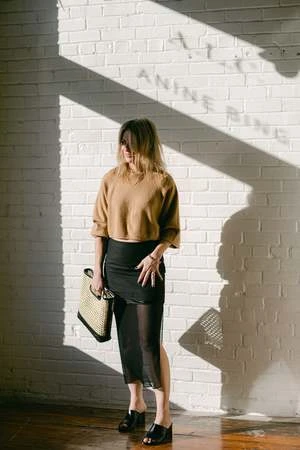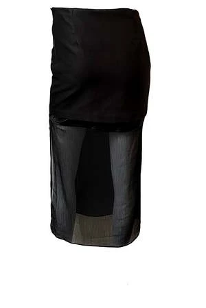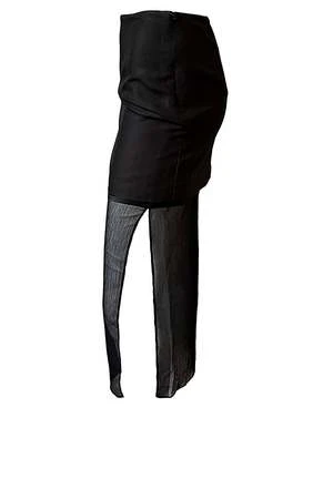 This skirt by Helmut Lang feature tailored skirting with a sheer underlay and side slit.