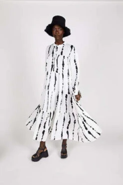 The sharpie inspired squiggle print on this white flowing maxi keeps this piece effortlessly modern. Long sleeved, tiered and flowy, this i s a statement piece that makes getting dressed easy.