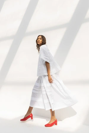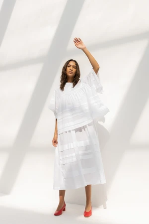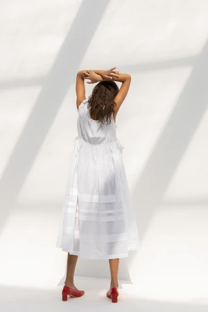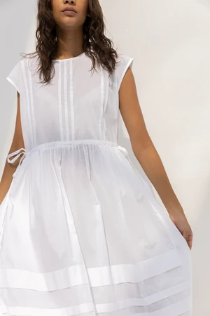 Camille Dress features an adjustable drawstring at the waist which can be cinched in or left loose. Made from organic cotton voile, it features pleats through the bodice and folds through the skirt to add dimension while subtle capped sleeves and a rounded neckline ensure ease of wear.
