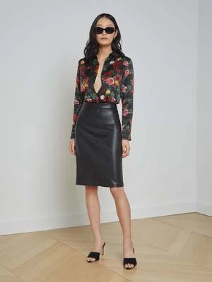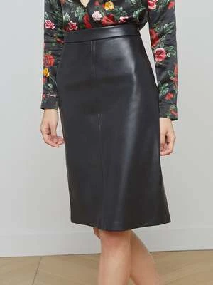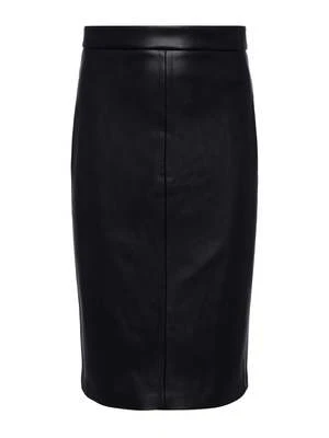 A smart pencil skirt in black faux leather. Skirt falls straight to hem from comfortable contoured waistband that hugs the natural waist. Style includes center front seam, back waist darts, and back hem slit. Hidden back zip closure.