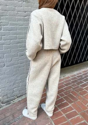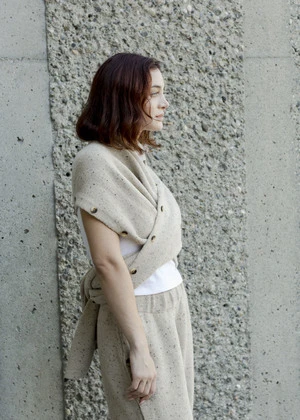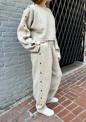 A cozy pair of trousers from Lauren Manoogian, featuring a donegal flecked woolen yarn that has a subtle stretch to it. Button detail on the sides allows for versatile styling. Details include side seam pockets and a comfortable elasticated waist.