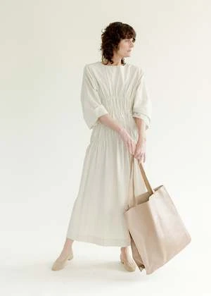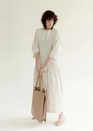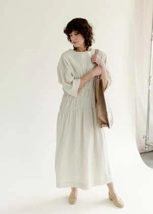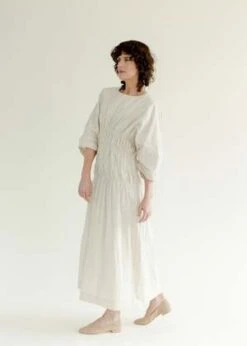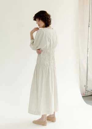 This lightweight smocked dress from Lauren Manoogian is cut in a crisp cotton / linen blend, perfect for warm spring days. Interior elastic waist banding and elastic gathering at the sleeves give the dress a unique silhouette. Rounded, wide sleeves.