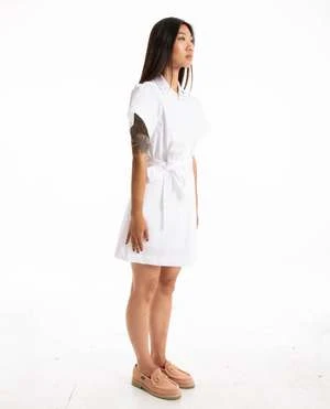 Natalia Dress in white by Malbon Golf. The Natalia Dress is crafted from lightweight fabric, making it perfect for the warmer months. It features a subtle M Script Logo Embroidered on the Left Collar and a Tie at the Waistband for an adjustable fit. It is finished off with a Zipper Closure at the Center Front and a Pull Tab for quick and easy access.