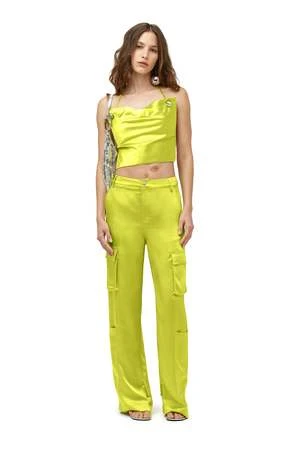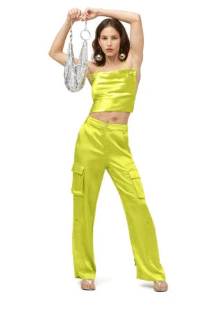 High-rise straight leg cargo satin pants with button and zipper closure.