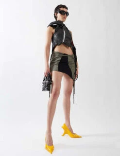 Two-tone mini skirt in organic cotton jersey fabrication. Loose strap detail. Little stretch. Rolled edges and self-tie straps throughout.