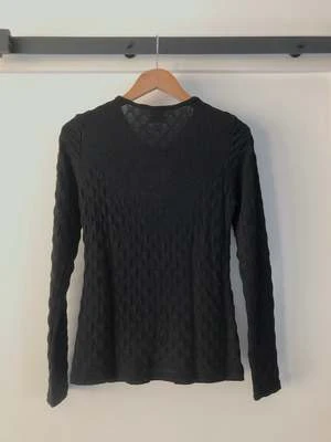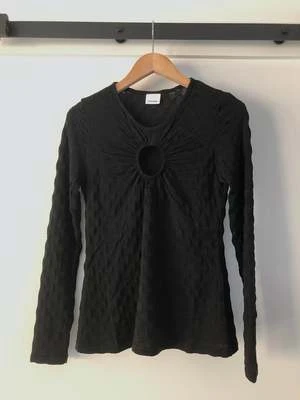 The Margo Top is a fitted long sleeve knit shirt with an unexpected circle cutout detail. Made of a puckered knit fabric. Available in Solid Black or Garnet.