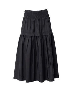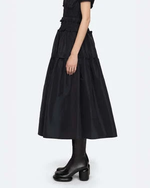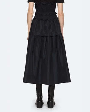The Diana Skirt in Black by Sea New York is a midi length, taffeta skirt featuring a smocked waistband and tiered fabrication.