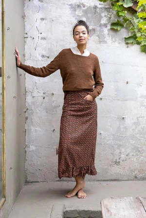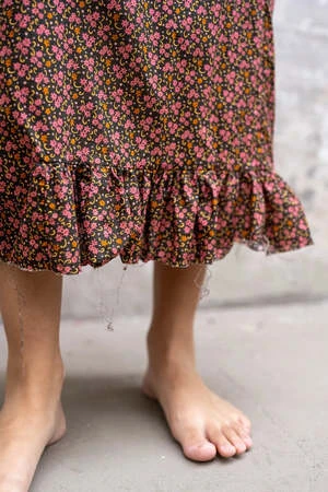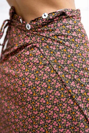 Flower Printed wrap skirt, step into this beautiful design and then wrap the ties at your waist, there are 3 buttons at the waist to adjust sizing. Flat front with one patch pocket, straight with a slight a-line shape and frilly ruffle bottom detail. Soft, lightweight cotton over-dyed into a faded flower print. Fits true to size, model is 5’9 and wears a size small.
