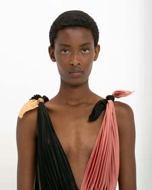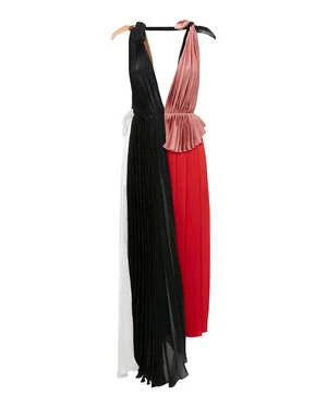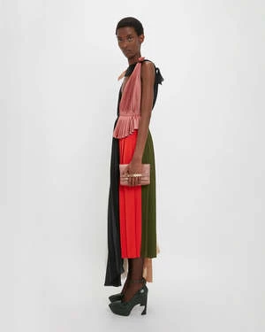 The Asymmetric Pleated V-Neck Dress in Black-Multi by Victoria Beckham is a patchwork pleated dress crafted in a multicolored fabrication with sunray and knife pleating with a deep-V neckline.