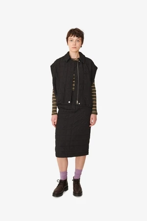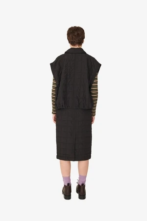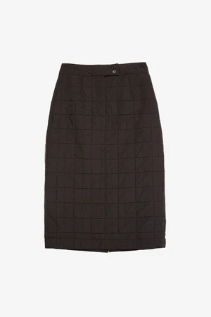 Contemporary skirt with a classic midi length cut in a technical Italian quilted polyester fabric. Italian Polyester Quilted Fabric. Mid Length Skirt With Back Vent. SideSeam Pockets. Front Opening. Corozo Buttons.